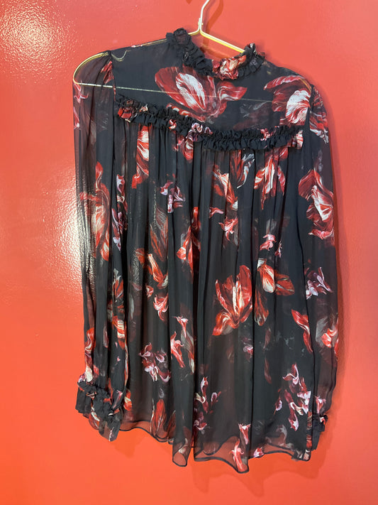 Alexander McQueen Black Floral Sheer Blouse with Ruffle 40